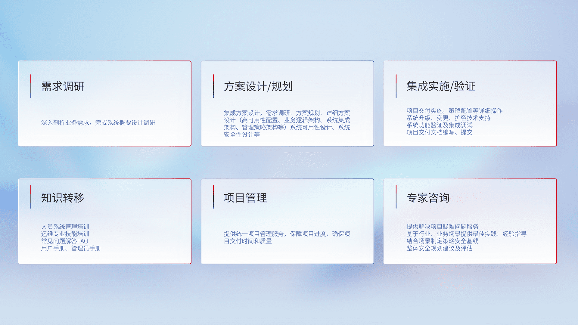 针对客户行业特性,,将宏观的安全战略和需求,,,,通过专业的交付服务,,实现项目落地,,,,为客户提供标准规范的集成交付服务。。。。
